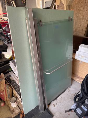 A few items free 2 shower doors Cabinet with wheels Fustable Pair of ski Globe light