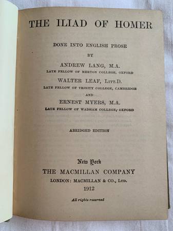 A hardcover edition of "The Iliad of Homer" published by Macmillan in 1912. The first 18 pages of chapter 1 have been cleanly cut out as shown. This book is more about history, antiques and collectables, than the actual story which can be easily read elsewhere. This is a classic work of literature, containing ~326 pages, is a nice addition for any collector or lover of ancient Greek poetry. The book is the pocket edition of "The Iliad".
