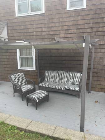 Metal pergola in good condition, but the canopy has a tear. The storage box could use a scrub with the power washer. Both have been disassembled for easy pickup.